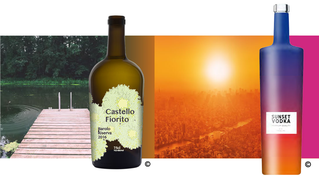 Le décor Soleil couchant s’inspire de couleurs vives et diffuses naturelles, et a été réalisé par Verallia Polska. La bouteille MIAMI est décorée par un laquage en dégradé rouge et bleu, sur lequel est apposée une sérigraphie éclatante.