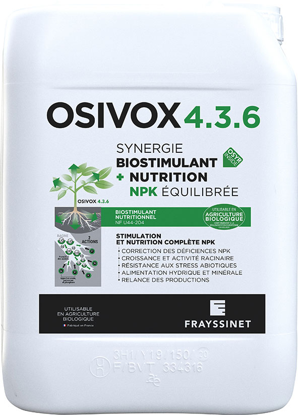 - Équilibre NPK (4.3.6) avec phosphore assimilable d’origine végétale à base d’acides aminés + OSYR
