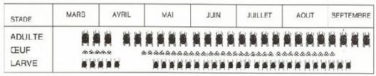 Cette espèce préfère les températures élevées. Les femelles se regroupent sous les vieilles écorces des ceps pour passer l'hiver. Vers mi-avril,les femelles hivernantes se nourissent sur les bourgeons et restent localisées sur la face inférieure des feuilles le long des nervures pendant l'été. La durée de vie des femelles varie en fonction de la température et de l'état du feuillage. Chacune peut pondre de 30 à 40 oeufs. Aux températures élevées, l'incubation et le développement s'accomplissent en 8 jours. |